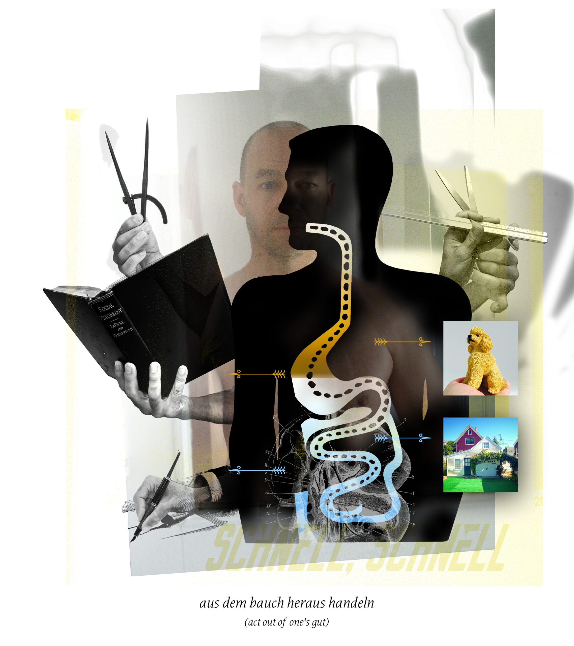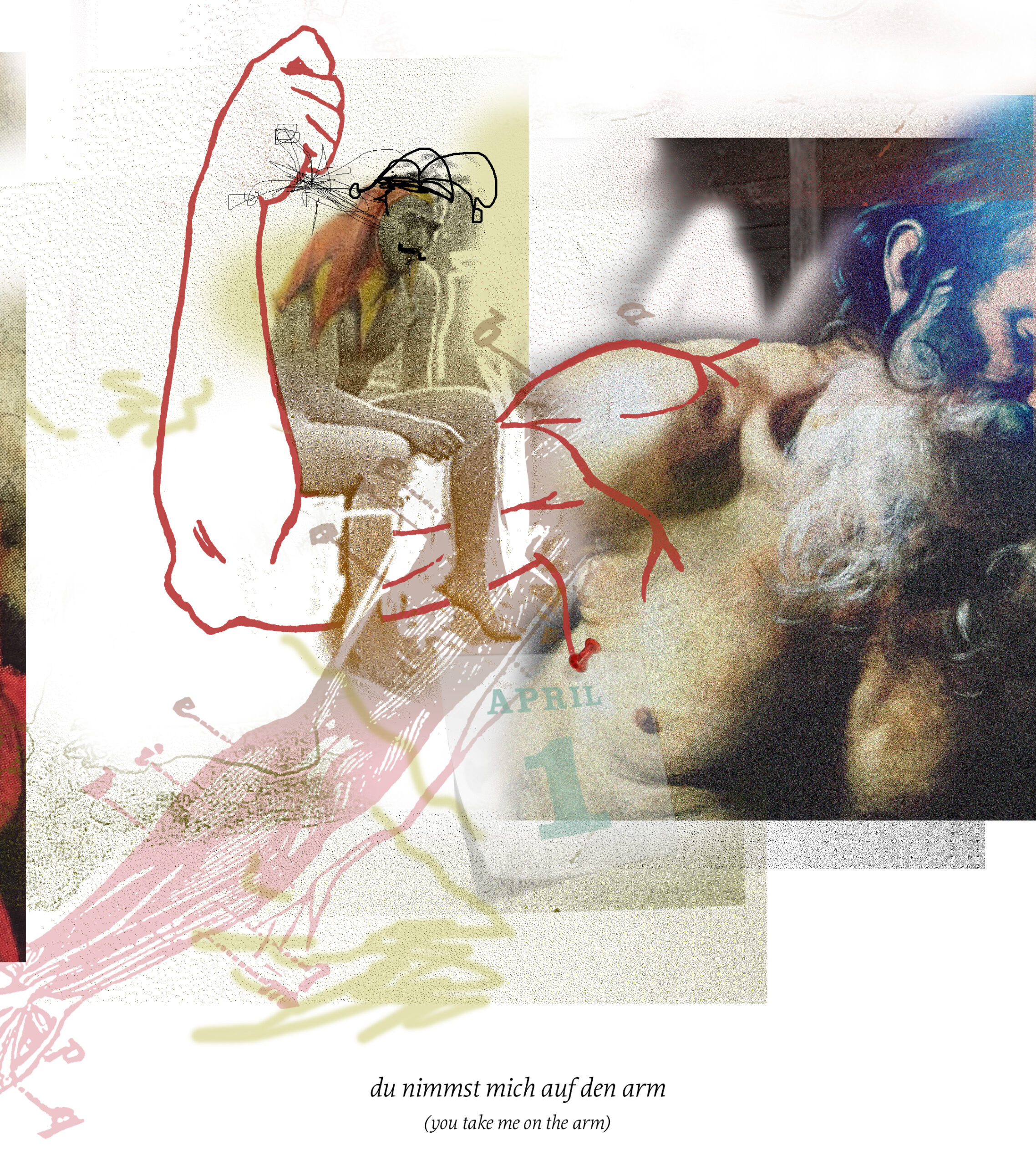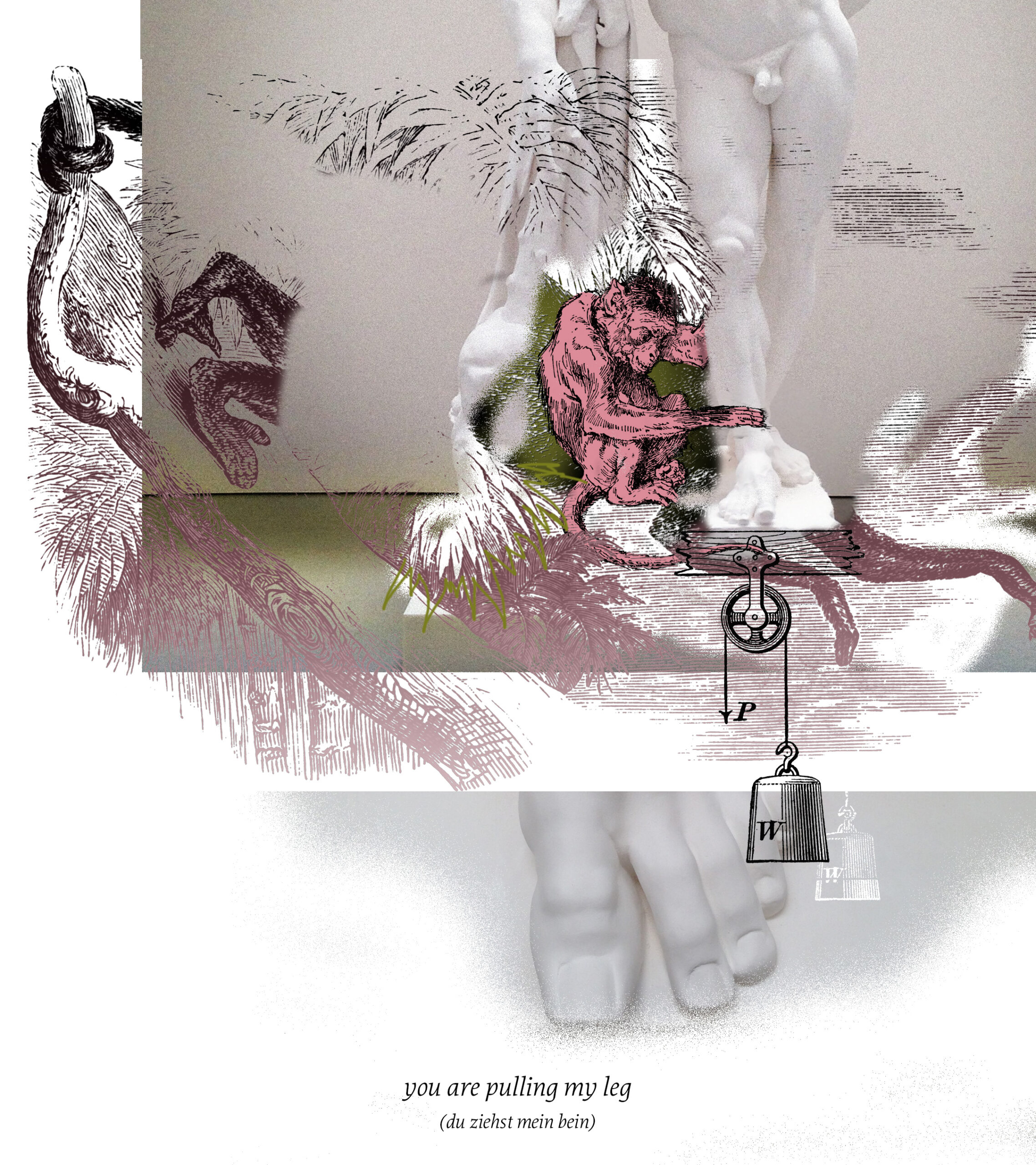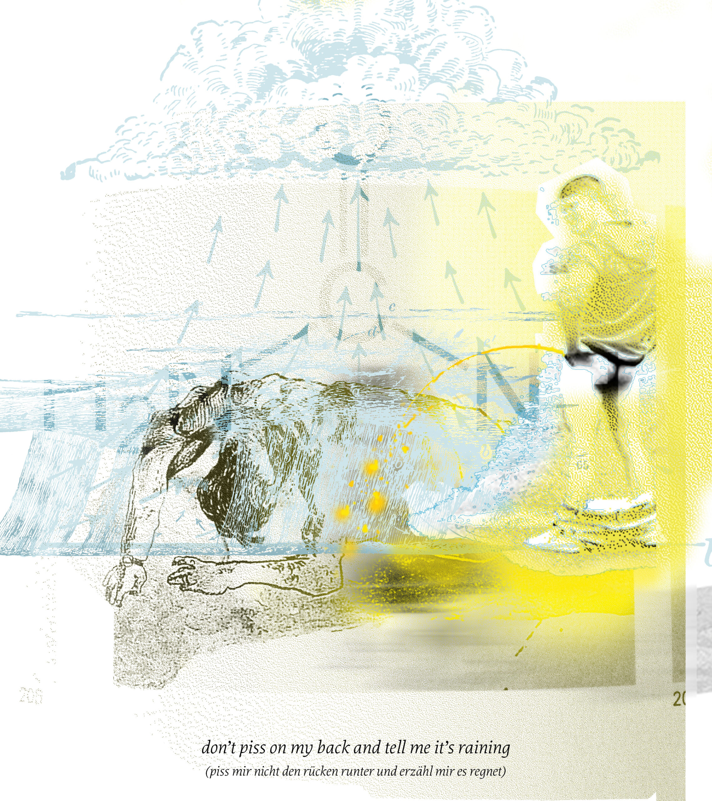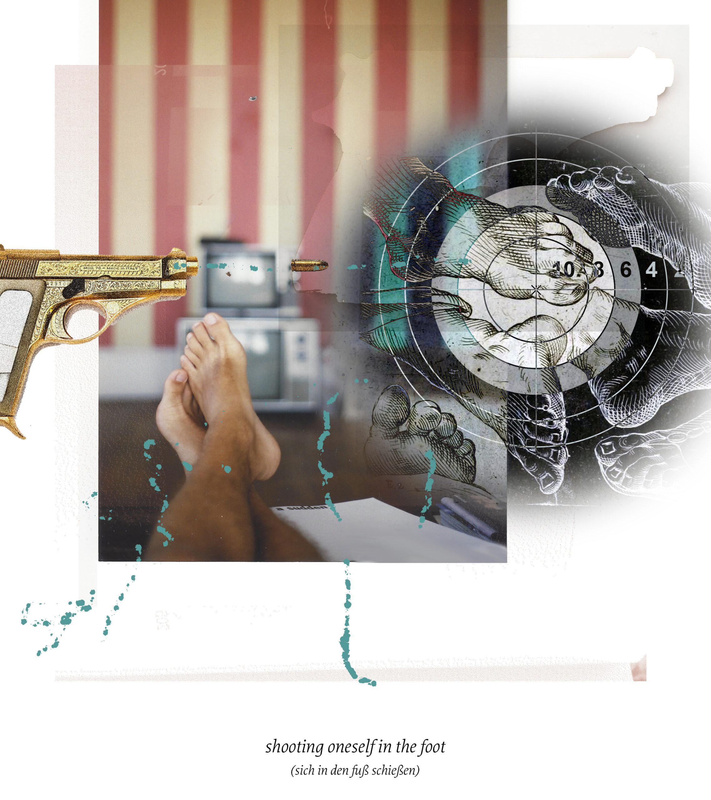 There are an estimated twenty-five thousand idiomatic expressions in the English language. Idioms in any language are very much informed by their respective cultures and therefore different in expression. Within one language the phrasing and the figurative or literal meanings are commonly understood. Yet, the imagery they provoke is not. When imagining idioms as visuals, we all have very different associations and will draw from various pools of symbols, colors and objects. In comparing German and English idioms I aim to uncover their humorous implications, especially when translated word-by-word.